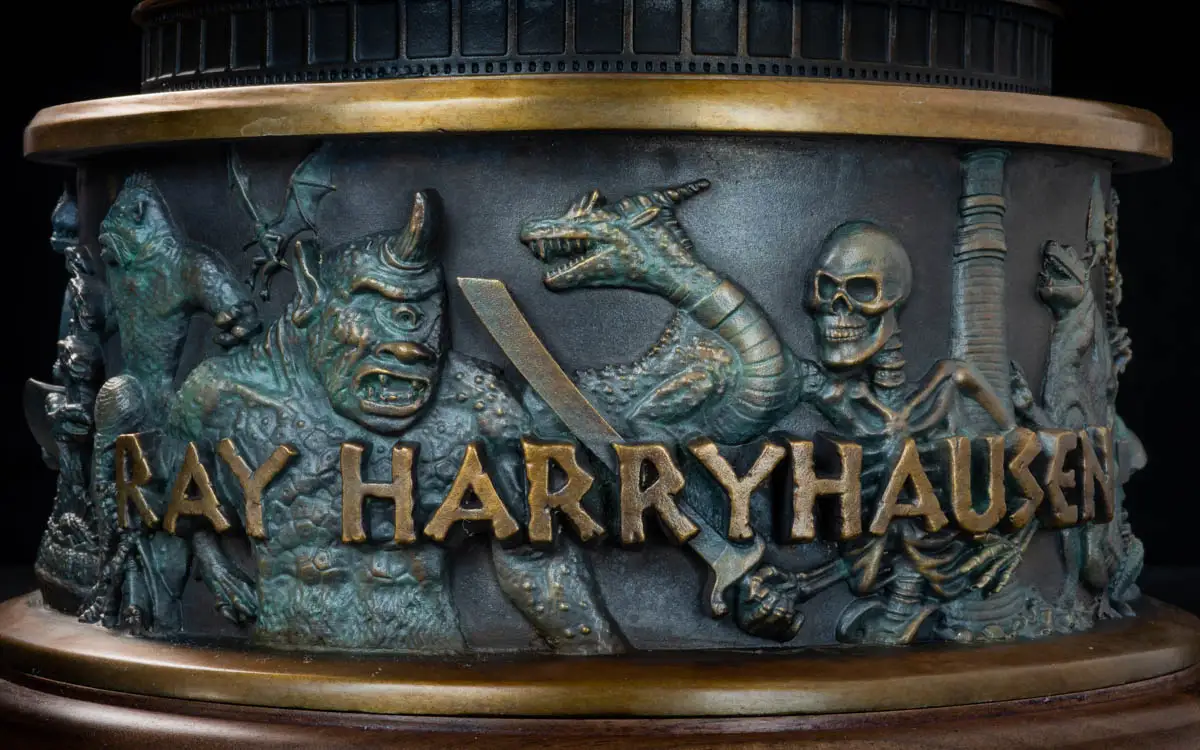 John sculpted a life size bust of Ray in homage to not only his creative achievements but also their friendship. This bronze captures Ray in middle age when he accomplished some of his greatest films and at the time John first became aware of his genius when growing up. The base of the bronze is wrapped in bas relief highlighting 21 of Ray’s most famous creature creations.